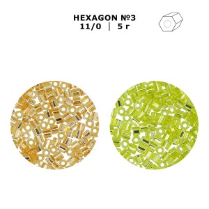 Шестиугольный бисер - Hexagon - очень близок по форме к цилиндрическому, но, тем не менее, имеет грани, которые отражают падающий на них свет при перемене угла зрения. Поэтому изделия из данного бисера получаются яркими и сверкающими. Может применяться для отделки театральных костюмов, а также для изготовления сумочек и аксессуаров для одежды.