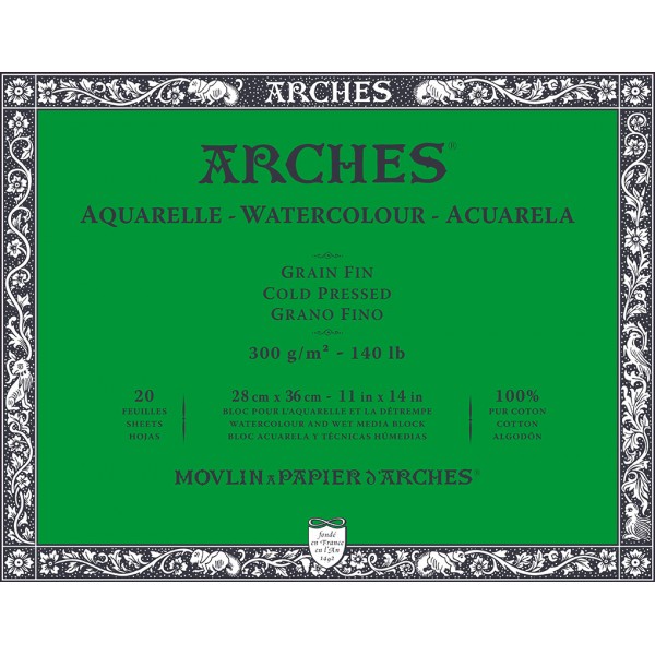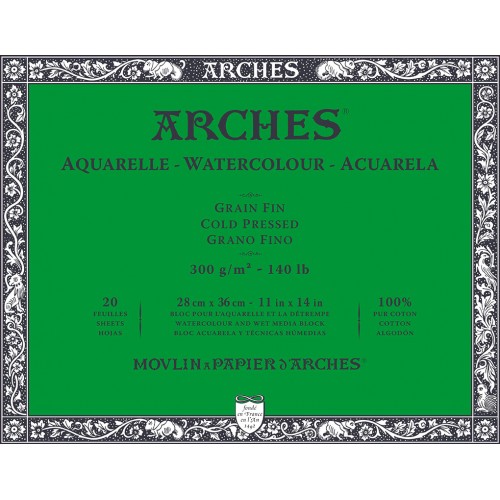 Блок для акварели Arches из 100\% хлопковой бумаги высочайшего качества. Бумага, изготовленная старинным способом с использованием листоотливных цилиндрических машин, поэтому её качество близко к качеству бумаги, изготовленной вручную. Желатиновая пропитка до сердцевины листа сохраняет блеск и прозрачность цветов, предотвращая проникновение красок в бумагу. Это делает бумагу устойчивой к исправлениям и царапинам. Бумага Arches может удерживать значительное количество воды без деформации, гарантируя, что цвета останутся яркими и прозрачными. Это делает ее отличным выбором для художников, ищущих высококачественные материалы для своих акварельных проектов. На каждом листе есть фирменный водяной знак. Склейка с четырех сторон.