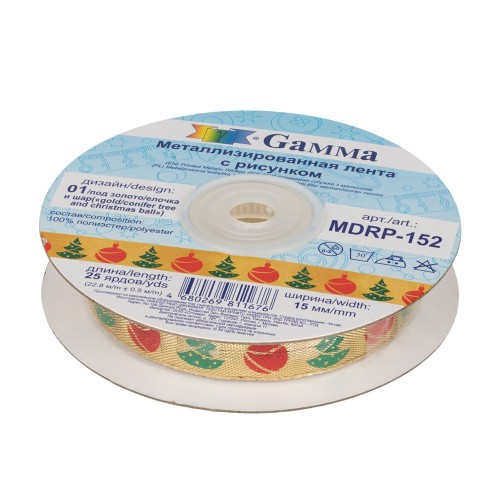 Gamma" МДРП-152 (MDRP-152) лента металлизированная 15 мм 22.8 м ± 0.5 м 01 под золото/елочка и шар/"gold