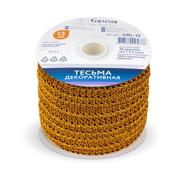 Gamma" тесьма декоративная "Булет" ГБЛ-15 металл (GBL-15) металл. 13 мм 33 м ± 0.5 м под метал.золото/"gold