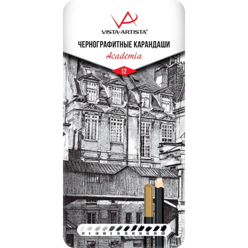 "VISTA-ARTISTA" "Academia" VAGPM-12 Шестигранные карандаши наивысшего качества, идеальный инструмент для рисунка, эскизов и чертежей. Корпус изготовлен из качественной, химически необработанной древесины липы, с хорошей проклейкой "тела" карандаша, благодаря чему обеспечена легкая и мягкаязаточка любым типом точилок. При изготовлении грифеля использована специальная система против ломкости.