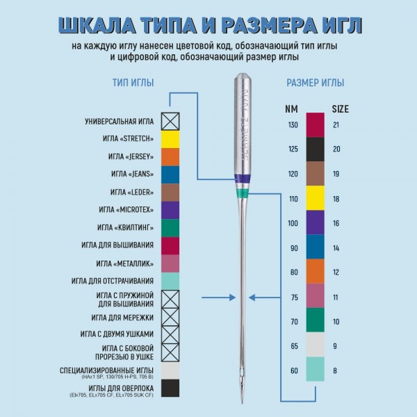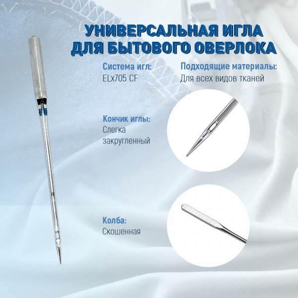 Швейные иглы ELx705 SUK (overlock) подходят для большинства бытовых оверлоков. коверлоков и плоскошовных машин. Они длиннее стандартных игл. имеют дополнительный желобок. который необходим для создания цепного стежка. С его помощью петлитель легче снимает нить с иглы (это помогает предотвратить пропуск стежков) и усиленное основание. которое повышает стабильность иглы и снижает риск ее поломки. Для беспроблемной обработки многочисленных видов материалов. Хромированное покрытие (CF) делает иглу более устойчивой к нагреву во время долгого шитья на высоких скоростях и деформации. Иглы для бытовых швейных машин - очень важные инструменты для рукоделия. Правильно подобранная швейная игла гарантирует качественное выполнение строчек. и Вы. безусловно. получите удовольствие от работы Острие инструмента проходит между петлями. не прокалывая их. Гладкое ушко предотвращает разрыв и спутывание нити. кончик иглы заточен особым образом. что обеспечивает легкий ход и предотвращает порчу материала. Стальные иголки дают качественную строчку. стежки получаются ровными. не делают пропусков. Иглы выполнены из прочного металла. острые и прослужат Вам долго.