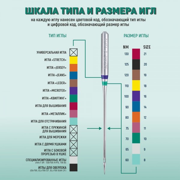Иглы 130/705 H для бытовых швейных машин - очень важные инструменты для рукоделия. Правильно подобранная швейная игла гарантирует качественное выполнение строчек. и Вы. безусловно. получите удовольствие от работы. Острие инструмента проходит между петлями. не прокалывая их. Гладкое ушко предотвращает разрыв и спутывание нити. кончик иглы заточен особым образом. что обеспечивает легкий ход и предотвращает порчу материала. Стальные иголки дают качественную строчку. стежки получаются ровными. не делают пропусков. Иглы выполнены из прочного металла. острые и прослужат Вам долго. Пусть творчество приносит радость и комфорт в хобби!