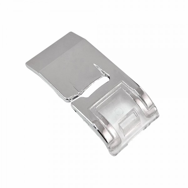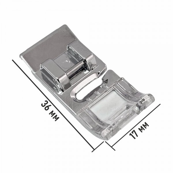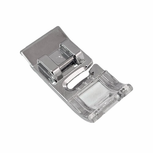 Лапка используется для пришивания лент и тесьмы. Благодаря прозрачному пластику увеличивается обзор рабочей зоны и контроль над процессом. За счет направляющего отверстия лента или тесьма ложится ровно. получая при этом равномерную строчку. Дополнительного эффекта можно добиться с помощью декоративных строчек. Данная лапка подходит для большинства бытовых швейных машин.