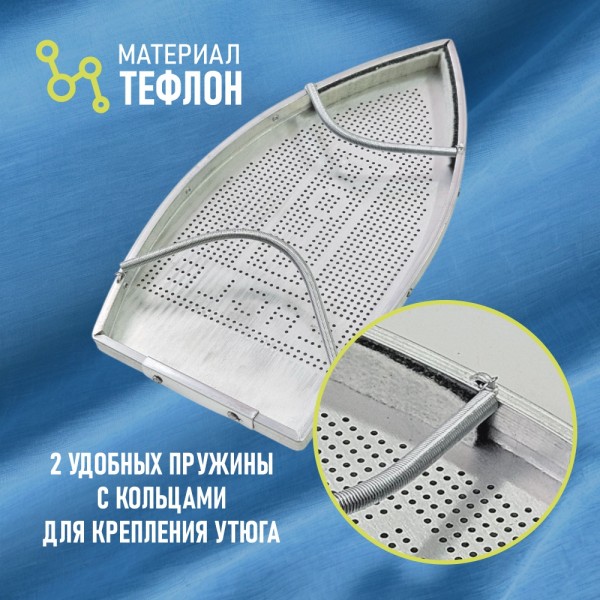Тефлоновая насадка для утюга – это незаменимая помощница при глажке. Тефлоновая накладка. в первую очередь. предназначена для использования на утюгах и парогенераторах промышленного типа. Но. если размер подошвы бытового утюга подходит под параметры подошвы. то ее можно использовать и на бытовом утюге. Крепление насадки на утюг - универсальное. она крепится на подошву утюга с помощью металлической пружины. Множество отверстий в конструкции обеспечивают свободный выход пара. Легко крепится и снимается благодаря прижимной пружине. не соскальзывает и плотно прилегает к подошве. Внимание! Обязательно снимите размер подошвы вашего утюга и сопоставьте его с размером насадки на фото в карточке товара! Размеры на фото указаны по внутреннему краю!
