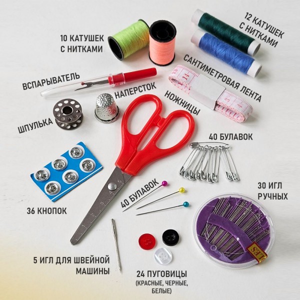 Катушки с разноцветными нитками 22 шт. Шпулька для швейной машины. Ножницы. Сантиметровая лента. Вспарыватель. Нитевдеватель. Наперсток. Иглы ручные 30 шт. Английские булавки 40 шт. Кнопки пришивные 36 шт. Иглы для швейной машины универсальные 5 шт. Пуговицы (черные. белые. красные) 24 шт.