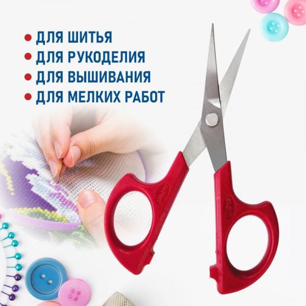 Ножницы с небольшими лезвиями. С помощью этих ножниц можно аккуратно обрезать нитки или края вышивки. прорезать петли. выполнить надсечки и т.д. Благодаря наличию острых кончиков. ножницы можно использовать и в других целях. например. как маникюрную принадлежность. а так же и для других бытовых мелочей. Эргономичные ручки удобно лежат в руке и делают работу комфортной.