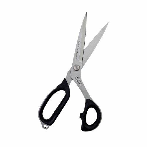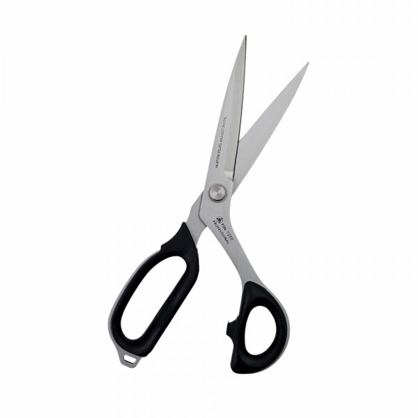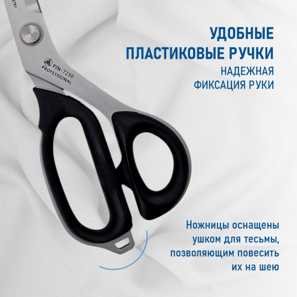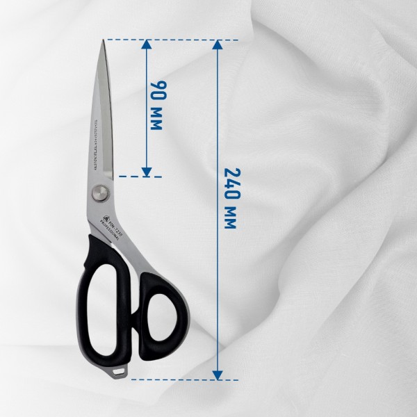 Портновские ножницы - это качественный. долговечный. надёжный инструмент. Ножницы изготовлены из высокоуглеродистой стали. Они предназначены для раскроя ткани различной плотности. Острые лезвия с угловой заточкой дают чистый и ровный раскрой без дополнительных усилий. Прорезиненные ручки ножниц обеспечивают комфортное и удобное использование даже при длительной работе. Ножницы оснащены ушком для тесьмы. позволяющим повесить их на шею.