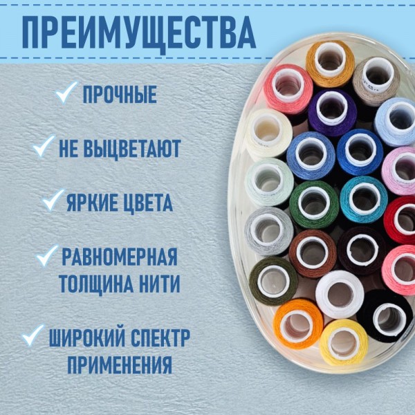 Откройте мир творчества с набором швейных ниток. состоящим из 22 цветов по 200 метров. Этот швейный набор ниток идеален для любого вида рукоделия и шитья. Нитки швейные. изготовленных из высококачественного материала 35лл. обладают прочностью и хорошей устойчивостью к высоким температурам. что делает их отличным выбором для швейных машин. включая оверлок. Набор идеально подойдет для пошива штор. ремонта одежды. для пришивания фурнитуры. бусин. бирок. аксессуаров. декоративных аппликаций. пуговиц и для выполнения ручного ремонта. Это действительно универсальный продукт: он подходит как для дома. так и в школу - будет полезным аксессуаром как на уроках труда. так и при создании текстильной игрушки или кукольной одежды. Зеленые. белые или красные - выбор цветов в этом наборе просто поражает. Качество материалов и производства гарантировано. так как товар произведен на территории России. С этим набором ниток вы всегда будете готовы к любому проекту.