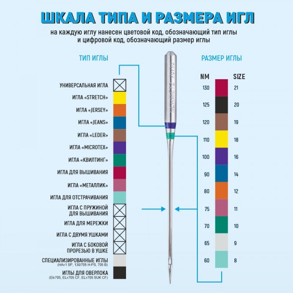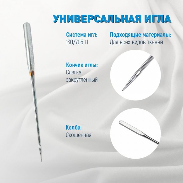 Иглы 130/705 H для бытовых швейных машин - очень важные инструменты для рукоделия. Правильно подобранная швейная игла гарантирует качественное выполнение строчек. и Вы. безусловно. получите удовольствие от работы. Острие инструмента проходит между петлями. не прокалывая их. Гладкое ушко предотвращает разрыв и спутывание нити. кончик иглы заточен особым образом. что обеспечивает легкий ход и предотвращает порчу материала. Стальные иголки дают качественную строчку. стежки получаются ровными. не делают пропусков. Иглы выполнены из прочного металла. острые и прослужат Вам долго. Пусть творчество приносит радость и комфорт в хобби!