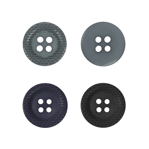 Пластиковая пуговица костюмная ТМ "BLITZ", артикул: DRN 0072 круглая на четыре прокола, диаметром 20 мм. Классическая, на окантовки имеется гравировка.