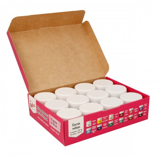 Набор матовых акриловых красок 12 цветов по 20 мл. Состав: 102 Белая . Матовые краски Idea Vista-Artista изготовлены на основе водно-акриловой дисперсии с применением специального наполнителя, который устраняет блеск, сохраняя насыщенность и яркость цвета. Имитируют эффект меловых красок, но не требуют специального покрытия. Высокая концентрация пигментов обеспечивает превосходные покрывные свойства. Устойчивы к воздействию внешней среды, светостойкие, укрывистые и быстросохнущие. Легко смешиваются с другими цветами. Хорошо ложатся на дерево, картон, бумагу, кожу, пенопласт, пластмассу, стекло, металл, камень, изделия из глины, моделирующую пасту и др. Используются для живописи и декоративно-прикладного творчества.