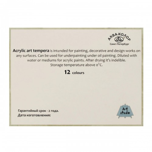 В основе художественной темперы «Аква-Колор» используется акриловая эмульсия. Это позволяет сохранить яркость и насыщенность цветового тона краски после высыхания красочного слоя.