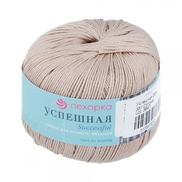 Пряжа "Успешная", ТМ Пехорский текстиль. Для вязания предметов одежды и аксессуаров. Сезон: Демисезон / Лето. 100\% мерсеризованный хлопок, т.е. сырье, природные свойства которого были улучшены в ходе выработки нитей. Нить плотная, крепкая, очень качественная. Она производится по итальянской технологии. Вязаные из нее вещи хорошо держать форму, не деформируются после стирки и не теряют ни цвета, ни внешнего вида. А живой блеск мерсеризованного хлопка придает им особую пикантность. Можно вязать спицами, крючком, на машинке. Но лучше вяжется крючком, который позволяет создавать более четкий рисунок. В подборе узоров для спиц можно остановить выбор на некрупных ажурных мотивах или плотных. Это предотвратит провисание полотна. Палитра цветов - все оттенки цветущего лета. Из-за того, что пряжа - ОЧЕНЬ гигроскопичный товар, она легко набирает и легко отдаёт влагу. Указанный на мотке вес - это так называемый "кондиционный" вес. Нормативная влажность пряжи - 18,25\%, а реальная обычно бывает меньше - 14-15\%. Поэтому, при взвешивании пряжи в "обычных" комнатных условиях, данные по весу могут отличаться от указанных на мотке. Контрольное взвешивание, при определенной влажности и температуре, должно проводиться только в спец. лабораториях. Претензии по весу принимаются только при наличии официального заключения лабораторий, либо при очевидной разнице - более 30\%. Тип пряжи: Классическая Цветовая палитра: однотонные цвета Толщина нити: средняя Длина нити: 220 м Вес: 50 г Состав: 100\% мерсеризованный хлопок Рекомендуемый диаметр спиц/крючка для пряжи - 2.0-3.5 мм Примечание: цвет товара может отличаться от цвета фото