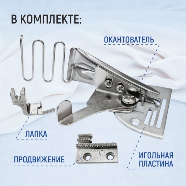 Окантователь А10 предназначен для обработки края сшиваемого изделия косой бейкой в 4 сложения.