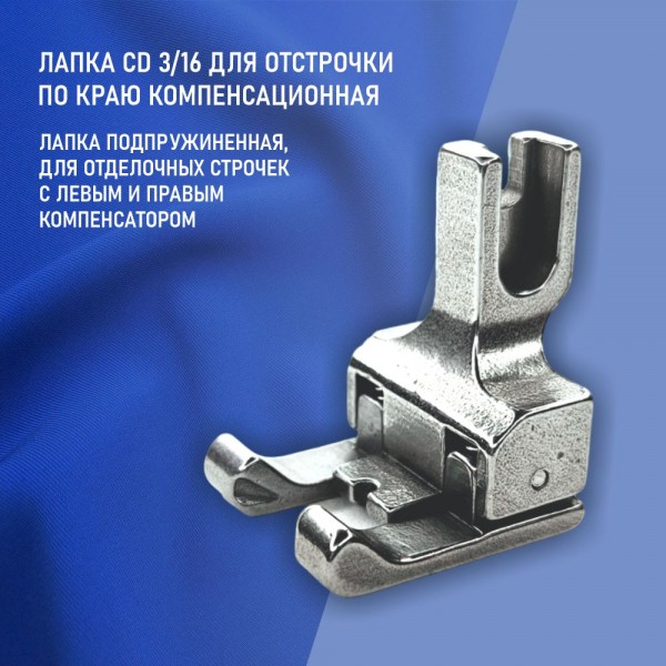 Лапка CD 3/16 для отстрочки по краю компенсационная. Лапка подпружиненная. для отделочных строчек с левым и правым компенсатором. Возможная ширина отделочной строчки 4.8 мм. Ипользуетя на промышленной прямострочной швейной машине с нижним продвижением ткани. Прижимная лапка CD имеет специальную подошву. состоящую из двух подпружиненных рожков. Обратите. пожалуйста. внимание. что лапка для отстрочки доступна в разных размерах.