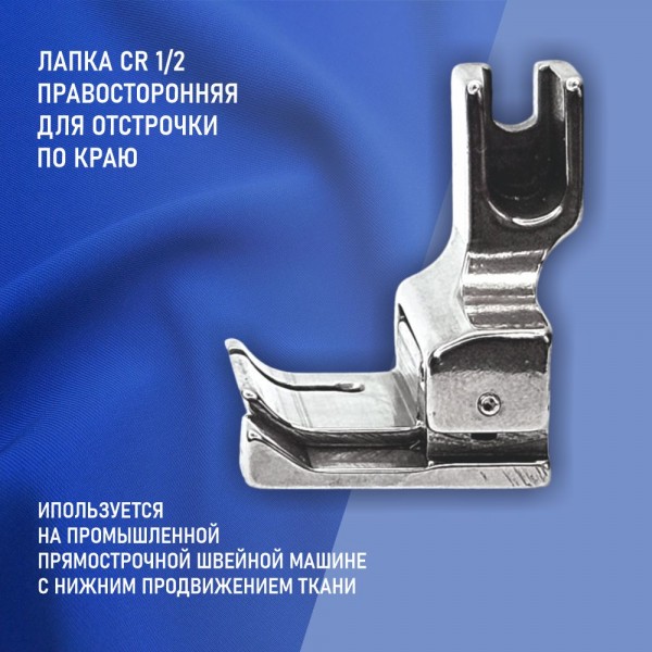 Лапка CR правосторонняя для отстрочки по краю. Ипользуетя на промышленной прямострочной швейной машине с нижним продвижением ткани. Прижимная лапка CR имеет специальную подошву. состоящую из двух отдельных рожков разной высоты. У компенсационной лапки CR подпружинен правый рожок. который играет роль бортика. что ограничивает край материала. Обратите. пожалуйста. внимание. что правосторонняя лапка для отстрочки доступна в разных размерах.