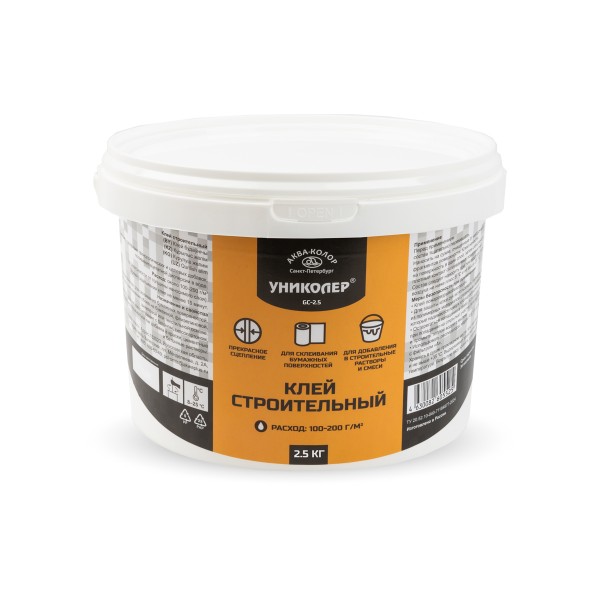Строительный клей GC-2.5 "УНИКОЛЕР" предназначен для склеивания бумажных поверхностей. Применяется для наклеивания обоев на бумажной, флизелиновой, виниловой или текстильной основе. Обеспечивает прекрасное сцепление с бетоном, гипсокартоном, штукатуркой. Может использоваться как добавка в краски, цементные и бетонные растворы. Время схватывания клея не менее 15 минут. Расход: 100-200 г на 1 м2 при сплошном нанесении в зависимости от типа поверхности.
