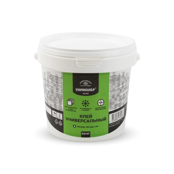 Универсальный клей GU-0.9 "УНИКОЛЕР" предназначен для склеивания различных типов поверхностей — картона, кожи, стекла, фарфора, текстиля, дерева, линолеума или ковролина. Не имеет резкого запаха. Характеристики клея ПВА универсального позволяют применять клеевой состав при температуре до -20 С°. Специальные добавки обеспечивают достаточно прочный шов. Имеет высокую степень устойчивости к морозу, выдерживает до -35 С°. Расход: 100-200 г на 1 м2 при сплошном нанесении в зависимости от типа поверхности.