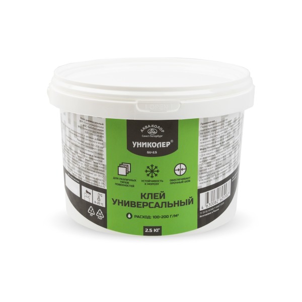 Универсальный клей GU-2.5 "УНИКОЛЕР" предназначен для склеивания различных типов поверхностей — картона, кожи, стекла, фарфора, текстиля, дерева, линолеума или ковролина. Не имеет резкого запаха. Характеристики клея ПВА универсального позволяют применять клеевой состав при температуре до -20 С°. Специальные добавки обеспечивают достаточно прочный шов. Имеет высокую степень устойчивости к морозу, выдерживает до -35 С°. Расход: 100-200 г на 1 м2 при сплошном нанесении в зависимости от типа поверхности.