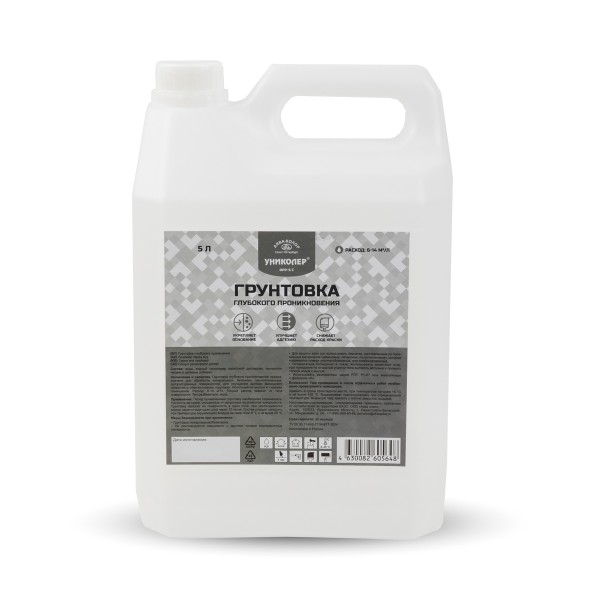 Грунтовка глубокого проникновения DPP- 5 C "УНИКОЛЕР" для внутренних и наружных работ, применяется для обработки бетонных, оштукатуренных, гипсокартонных, кирпичных и деревянных поверхностей. Наносится валиком, кистью или распылением. Глубоко проникает и укрепляет основание, обеспыливает и улучшает сцепление покрытия с поверхностью. Выравнивает впитывающую способность и уменьшает расход финишных ЛКМ. Не имеет запаха, быстро сохнет. Расход: 1л на 6-14 м2 в один слой. Расход может меняться в зависимости от впитывающей способности основания и способа нанесения.