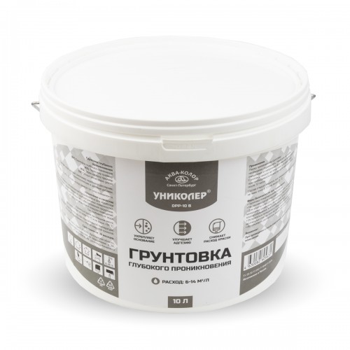 Грунтовка глубокого проникновения DPP- 10 B "УНИКОЛЕР" для внутренних и наружных работ, применяется для обработки бетонных, оштукатуренных, гипсокартонных, кирпичных и деревянных поверхностей. Наносится валиком, кистью или распылением. Глубоко проникает и укрепляет основание, обеспыливает и улучшает сцепление покрытия с поверхностью. Выравнивает впитывающую способность и уменьшает расход финишных ЛКМ. Не имеет запаха, быстро сохнет.