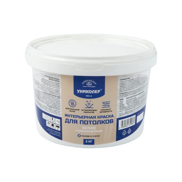 УНИКОЛЕР" Интерьерная краска для потолков PFC-3 применяется для внутренних работ: окраски потолков в сухих помещениях по бетонным, оштукатуренным, гипсокартонным поверхностям, ДСП, ориентированно-стружечная плита . Краска для потолков специально разработана для нанесения на сложные поверхности. Не образует капель и брызг, легко наносится, образуя равномерное покрытие. Без резкого запаха. Имеет плотную текстуру, позволяющую скрывать дефекты поверхности.