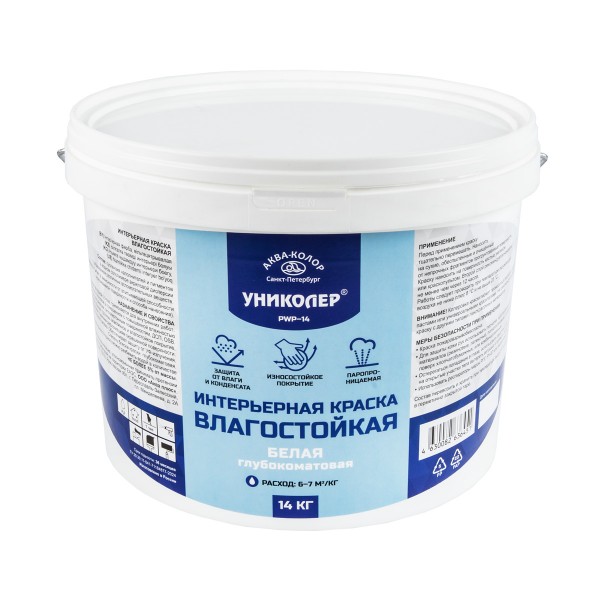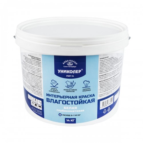УНИКОЛЕР" Интерьерная краска влагостойкая PWP-14 применяется для внутренних работ: окраски стен и потолков в помещениях с повышенной влажностью по бетонным, оштукатуренным, гипсокартонным поверхностям, ДСП, ориентированно-стружечная плита . После высыхания образует прочное, эластичное и влагостойкое покрытие, устойчивое к мелким деформациям окрашенной поверхности. Без резкого запаха. Обеспечивает защиту от УФ-излучения. Степень блеска краски: глубокоматовая. Расход: 6-7 м2/кг в зависимости от впитывающей способности окрашиваемой поверхности и способа нанесения.