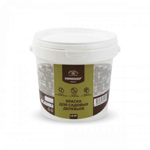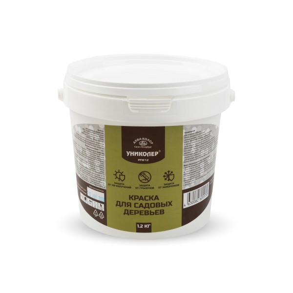 Краска для садовых деревьев PFW-1.2 "УНИКОЛЕР" предназначена для защиты стволов и крупных ветвей садовых деревьев и кустарников. Защищает кору молодых деревьев от солнечных ожогов, повышает стойкость плодовых деревьев к заморозкам и резким температурным перепадам. Также применяется для обработки спилов и ран. Защищает от грызунов. Не препятствует естественному воздухообмену древесины. Сохраняет защитные свойства не менее одного сезона.