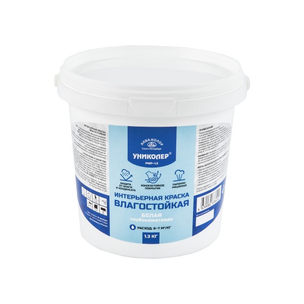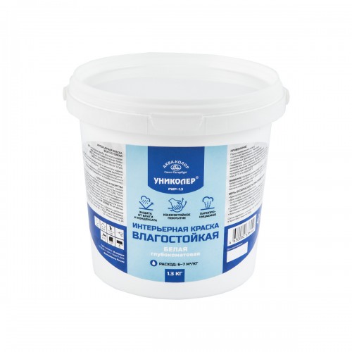 УНИКОЛЕР" Интерьерная краска влагостойкая PWP-1.3 применяется для внутренних работ: окраски стен и потолков в помещениях с повышенной влажностью по бетонным, оштукатуренным, гипсокартонным поверхностям, ДСП, ориентированно-стружечная плита . После высыхания образует прочное, эластичное и влагостойкое покрытие, устойчивое к мелким деформациям окрашенной поверхности. Без резкого запаха. Обеспечивает защиту от УФ-излучения. Степень блеска краски: глубокоматовая. Расход: 6-7 м2/кг в зависимости от впитывающей способности окрашиваемой поверхности и способа нанесения.