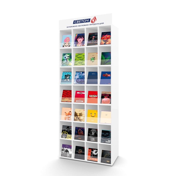 Стенд (стеллаж) для тетрадей не продается, а дается в безвозмездное пользование. Условием предоставления стенда в безвозмездное пользование является отгрузка под полное заполнение стойки. Первоначальная отгрузка должна быть 28 SKU тетрадей тм Светоч (любых) не менее 1 короба на 1 SKU. Далее ежемесячно должны быть заказы на подсортировку.