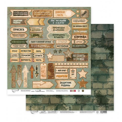 Бумага для скрапбукинга "Mr.Painter" PSR 201107 с уникальными дизайнами, разрабатывается и производится в России под контролем специалистов. Мужская бумага об армейской жизни поможет оформить как дембельский альбом юного солдата, так и памятные армейские фотографии военного со стажем. В коллекции 6 листов для вырезания с табличками, отличительными знаками, мотивациями, присказками.