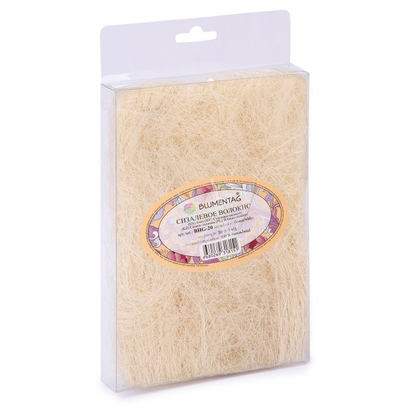 Сизаль "Blumentag" BHG-20 — натуральное грубое волокно, получаемое из листьев растения Agava sisolana из рода Агава. Сизаль используют в качестве наполнителя, так как воздушный эффект придает утонченность и свежесть изделию. Волокном декорируют формы из пенопласта, формируя нужный рельеф с помощью проволоки или нитей. Данный материал также распространен во флористике, упаковке подарков, используется как наполнитель в цветочных композициях. Используется при создании топиариев, в подарочных корзинах с фруктами, чайными и кофейными наборами, в свит дизайне и пр. Упаковка: 20 г ± 3 г. Примечание: цвет товара может отличаться от цвета фото. Оттенки сизаля могут различаться от партии к партии. Различия в плотности волокон, их структуре и пористости приводят к неравномерному впитыванию красителя и, как следствие, к различным оттенкам сизаля