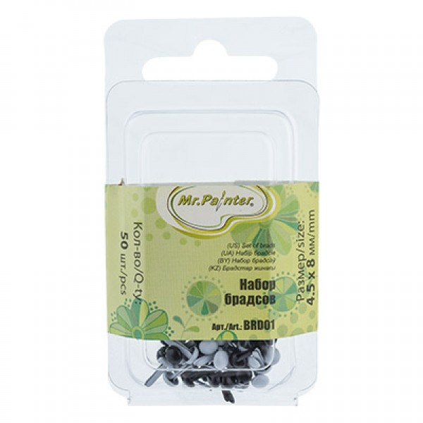 Брадс имеет раздвоенную гибкую ножку, которая продевается сквозь отверстие в бумаге, ленточке, картоне и т.д. и крепится путем отгибания двух частей ножки в разные стороны. Шляпки у брадс могут быть самыми разнообразными по форме и размеру .