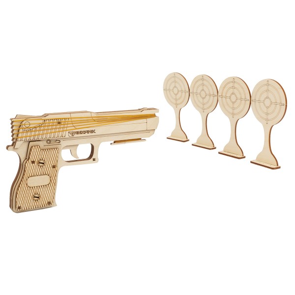 Торговая марка "REZARK" представляет серию детских развивающих наборов для сборки 3D-пазлов. В каждый набор входит пошаговая инструкция на русском языке. Пазлы представляют собой небольшие сборные 3D модели из плоских фанерных деталей. Толщина фанеры 3 мм. Для сборки моделей не требуется клей или клеевые материалы. Детали пазлов фиксируются между собой с помощью пазов. Рекомендуемый возраст: от 5 лет. Самая любимая игрушка - это та, которая сделана своими руками. В комлпект входит: резинкострел, 4 мишени и 6 резинок