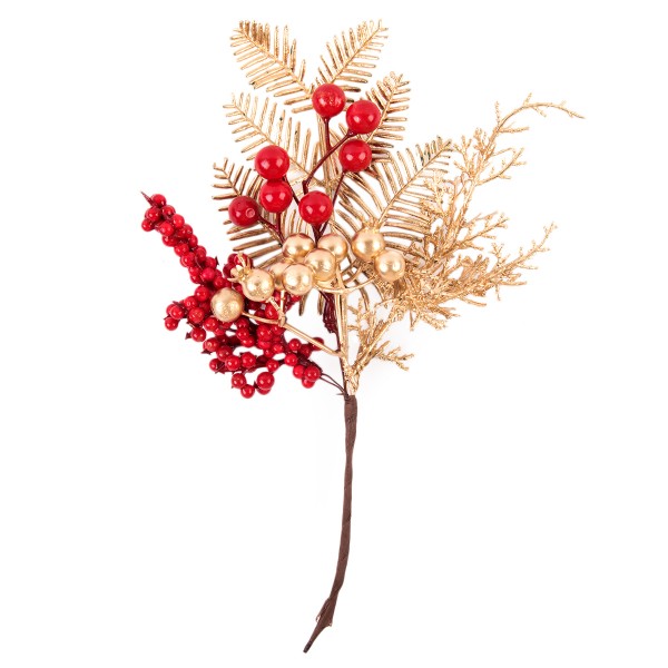 Декоративная веточка "Blumentag" VDD-135 используются во флористике, в композициях из искусственных цветов, в изготовлении новогодних венков, в топиариях, в декоре интерьера, оформлении подарков. Она прекрасно подойдет для создания осенней или зимней поделки. Основание из гибкой проволоки искусственной веточки обернуто флористической лентой, на веточке расположены декоративные ягоды и искусственная зелень.