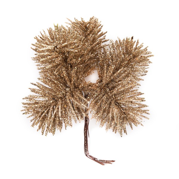 Декоративная веточка "Blumentag" VDD-139 используются во флористике, в композициях из искусственных цветов, в изготовлении новогодних венков, в топиариях, в декоре интерьера, оформлении подарков. Она прекрасно подойдет для создания осенней или зимней поделки. Основание из гибкой проволоки искусственной веточки обернуто флористической лентой, искусственная хвоя покрыта золотистым оттенком глиттера. Осыпание глитера не является браком. Длина 16 ± 1 см