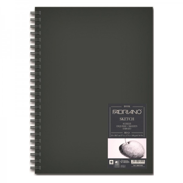 Альбомы Fabriano серии Sketch Book для зарисовок в твёрдой обложке, 80 листов, 110 г/м2. Бескислотная бумага из высококачественной целлюлозы, сертифицирована FSC. Практичная чёрная обложка. Альбомы доступны в формате блокнотов на спирале или сшивки. Альбомы идеально подходят для карандаша, пастели, чернил.