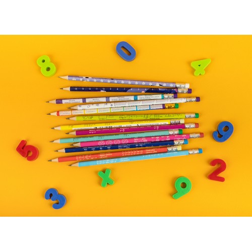 Карандаши имеют покрытие в виде пленки с декоративными паттернами. В серии яркие, интересные дизайны и специальная коллекция школьных карандашей подсказок с таблицей умножения и формулами, а также карандаши-линейки с делениями на сантиметры. С ластиком и популярной градацией твердости ТМ .