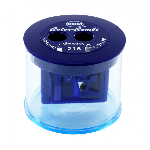 Яркая точилка от KUM с 2-мя отверстиями и контейнером для стружки в пластиковом корпусе. Одно отверстие предназначено для заточки закругленного кончика карандаша, второе - для острого.