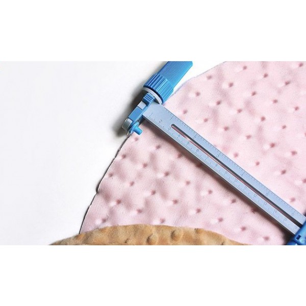 Нож-циркуль "Gamma" CK-380. Материал - металл, пластик. Применяется для круговой резки бумаги, ткани, кожи, резины и пр. Возможные диаметры кругов от 30 мм до 330 мм. Нож представляет собой балеринку, состоящую из подвижной ножки и оси с иглой. На подвижной ножке установлено и жестко закреплено лезвие c фиксатором, и нанесена шкала с делением 1 мм, предназначенная для выбора диаметра вырезаемого круга. Ось с иглой может перемещаться в пазу подвижной ножки и крепится винтовым фиксатором. В ось встроен контейнер для хранения запасного лезвия. Внимание! Чтобы лезвие резало ткань точно по круговой линии, необходимо чтобы ткань при работе не смещалась и была очень крепко зафиксирована на рабочей поверхности зажимами или двухсторонним тонким скотчем.