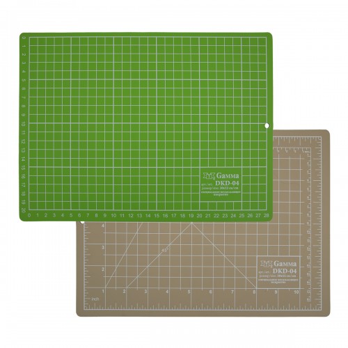 Мат для резки двустор. GAMMA DKD-04. Высококачественный двусторонний мат предназначен для кроя деталей различных форм, удобен при изготовлении аппликаций. Мат защищает рабочую поверхность стола от повреждений и порезов. Прекрасно подходит для моделирования деталей в пэчворке, простёгивании /квилтинге/, скрапбукинге и многих других техниках. Яркая поверхность мата удобна при крое темных материалов. Размер 30 см х 22 см Одна сторона коврика имеет разметку в сантиметрах, а другая - в дюймах, сантиметрах и угловую: 45° и 60°. Толщина 2 мм. Специальное нескользящее покрытие. Рекомендации по использованию для увеличения срока службы мата: - при работе с ножом, старайтесь держать нож под 90°; - при резке следует использовать разные участки его поверхности; - не скручивайте, не складывайте мат, т.к. мат может треснуть вдоль мелких порезов; - храните мат на плоской поверхности, вдали от прямых солнечных лучей; - мат нельзя подвергать резкому перепаду температур.