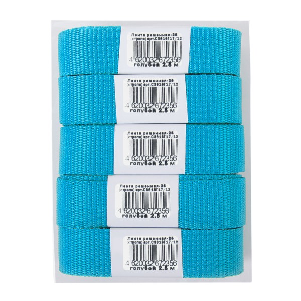 Лента ременная, стропа используется для производства сумок, рюкзаков, спецодежды и пр., производится из полипропилена. Вид ленты: стропа Кол-во: 5 шт. Ширина: 25 мм. Состав: 100\% полипропилен Линейная плотность ленты: 15.1 ±0.5 г/м
