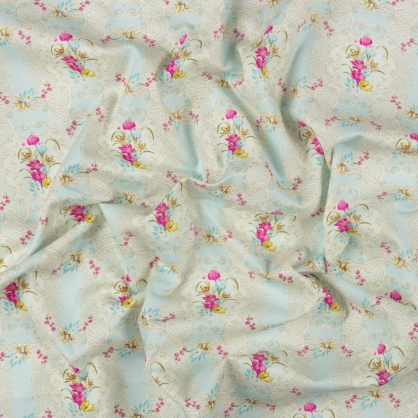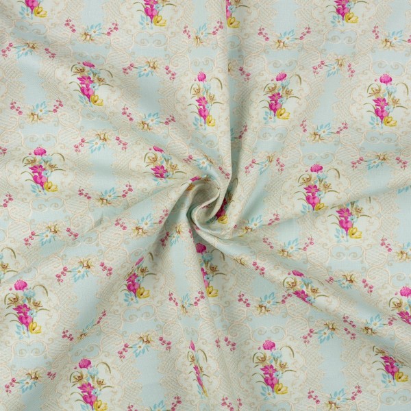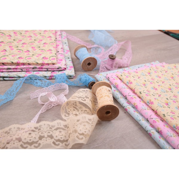 Ткани коллекции выполнены в нежной цветовой палитре с изображением изящных узоров из кудрявых тюльпанов, россыпи колокольчиков и винтажных элементов.
