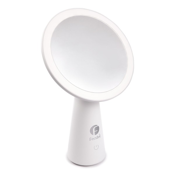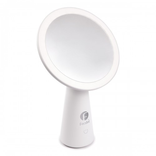 Зеркало для макияжа FERSTEL FR-51 с регулируемой LED-подсветкой Идеальное освещение для безупречного макияжа в любом месте! Благодаря встроенному аккумулятору и USB-зарядке зеркало можно использовать дома, в поездке или в студии — без привязки к розетке. Преимущества: • Регулируемая яркость подсветки — от мягкого свечения до яркого дневного света , что особенно важно для точного нанесения макияжа. • Сенсорная кнопка — включение/регулировка одним касанием. • Утяжелённое основание — надёжная устойчивость на любом туалетном столике. • Лаконичный белый дизайн из АБС-пластика впишется в любой интерьер. • Зеркало из качественного стекла , диаметр — 150 мм . Технические характеристики: • Источник света: 36 светодиодов • Мощность: 3 Вт ±10\% • Цветовая температура: 5000 К • Материал корпуса: ABS-пластик • Цвет: белый