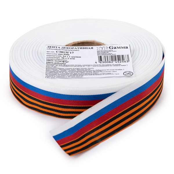 Совмещенная лента "Российская+Георгиевская". Георгиевская лента - главный атрибут 9 мая, черный и оранжевый цвет- означают "дым и пламень", олицетворяют подвиги русских воинов на полях сражений. Красный цвет ленты олицетворяет доблесть, смелость и победу. Лента триколор выполнена в цветах российского флага - белый, синий, красный. Ленты применяют в декоре, при оформлении наград, открыток. Ширина: 24 мм Состав: 100\% полиэфир