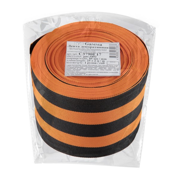 Лента "Георгиевская" Георгиевская лента - главный атрибут 9 мая, черный и оранжевый цвет- означают "дым и пламень", олицетворяют подвиги русских воинов на полях сражений. Ленту применяют в декоре, при оформлении наград, открыток. Ширина: 85 мм Состав: 100\% полиэфир